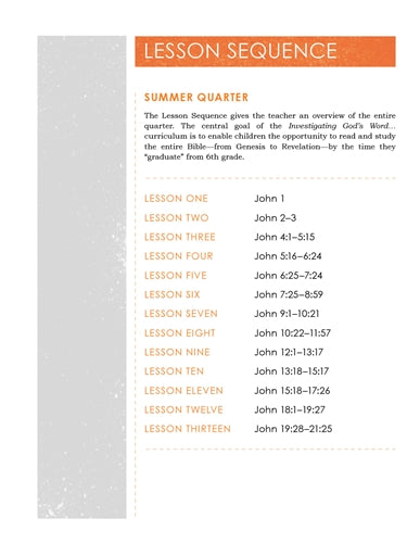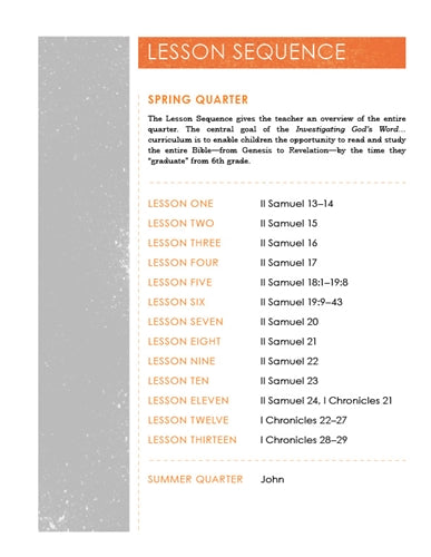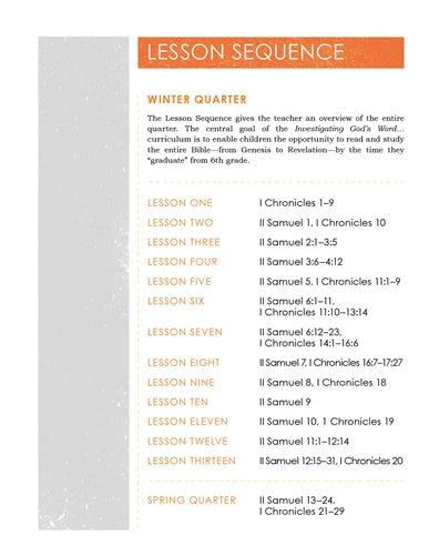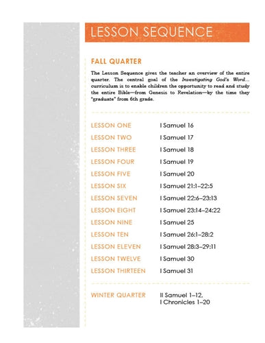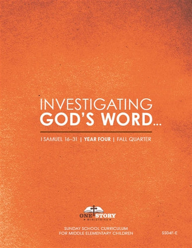 Investigating God’s Word Year Four is our Children’s Sunday School curriculum designed with 3rd graders in mind. Year Four curriculum covers I Samuel 16-31, II Samuel, I Chronicles, John. Each Teacher’s Manual binder includes 13 lessons, or one quarter of material. There are no student workbooks or worksheets included, as the curriculum is designed for students to interact with the teacher and their Bibles.