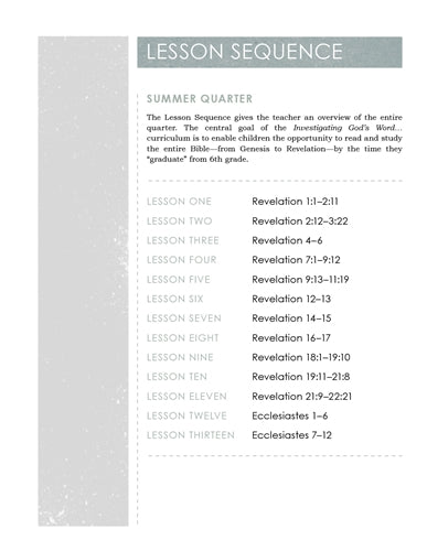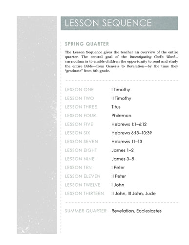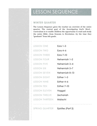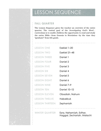 Investigating God’s Word Year Seven is our Children’s Sunday School curriculum designed with 6th graders in mind. Year Seven curriculum Ezekiel, Daniel, Obadiah, Nahum, Habakkuk, Zephaniah, Ezra, Nehemiah, Esther, Haggai, Zechariah. Malachi, I & II Timothy, Titus, Philemon, Hebrews, James, I & II Peter, I, II & III John, Jude, Revelation, Ecclesiastes. Each Teacher’s Manual binder includes 13 lessons, or one quarter of material. There are no student workbooks or worksheets included, as the curriculum is designed for students to interact with the teacher and their Bibles.