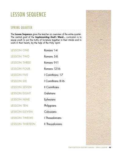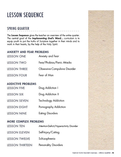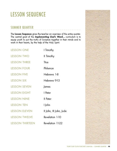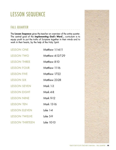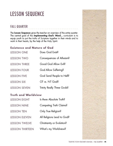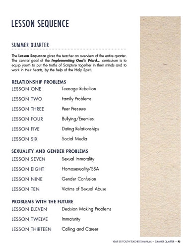 We desire for teachers and their students to be captivated by God’s Word. Therefore, we have minimized the “extras” often found in youth curricula in order to make the most of their time in God’s Word, and in Biblical thinking and application. There are no worksheets, journals, or skits. Teacher and students spend their time implementing the Bible, so they learn God’s Word, love God’s Word, and begin to live out God’s Word!